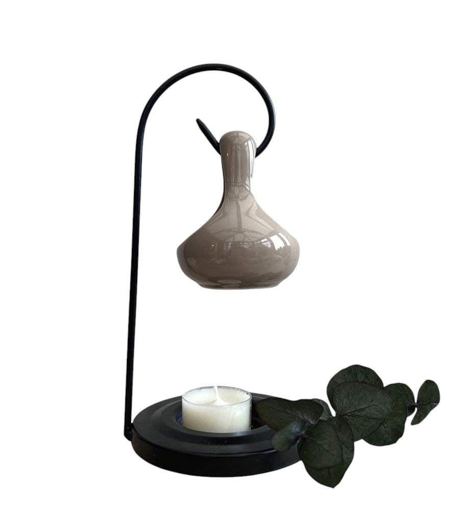 - Black metal stand with a hanging cream ceramic teardrop-shaped oil/wax carrier